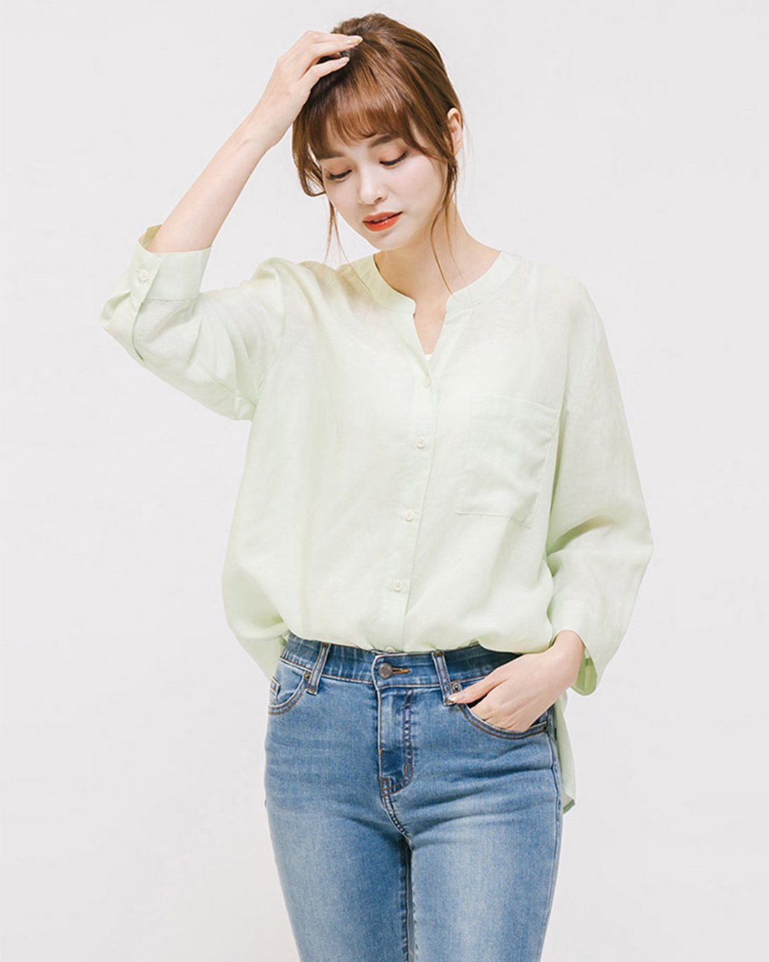 Áo sơ mi dáng suông, tay lửng, cổ tròn xẻ chữ V
