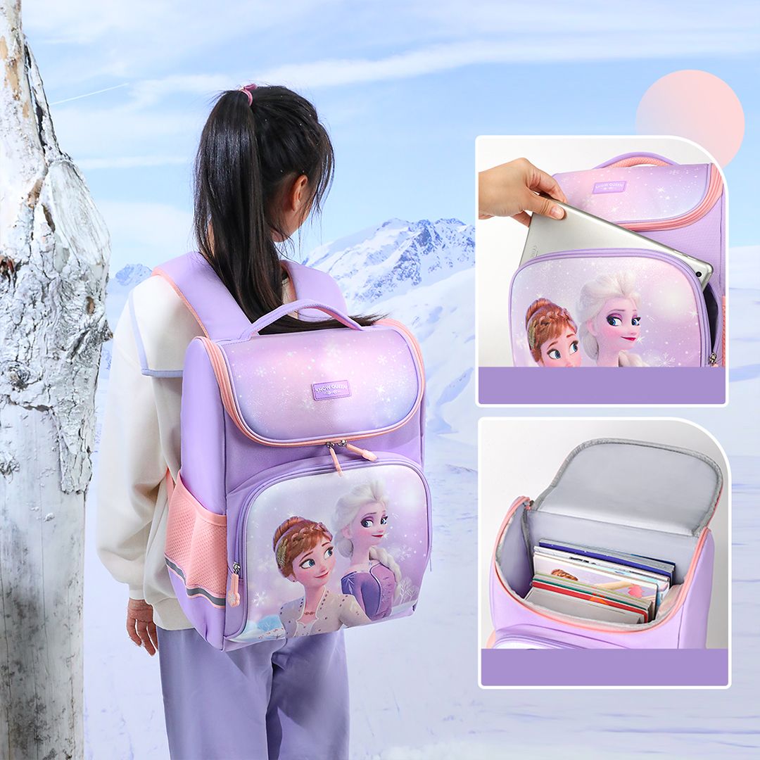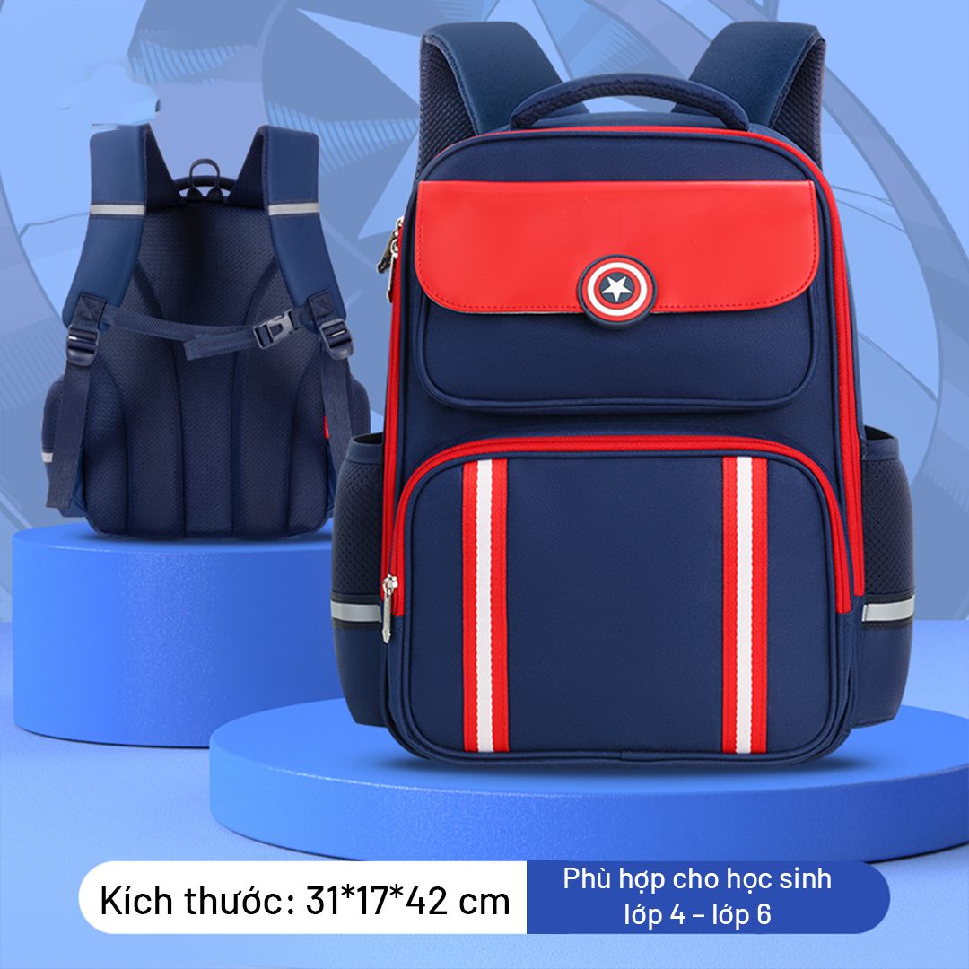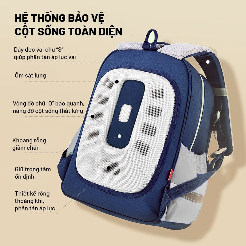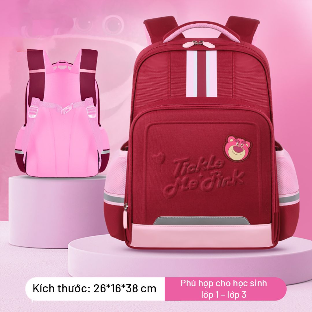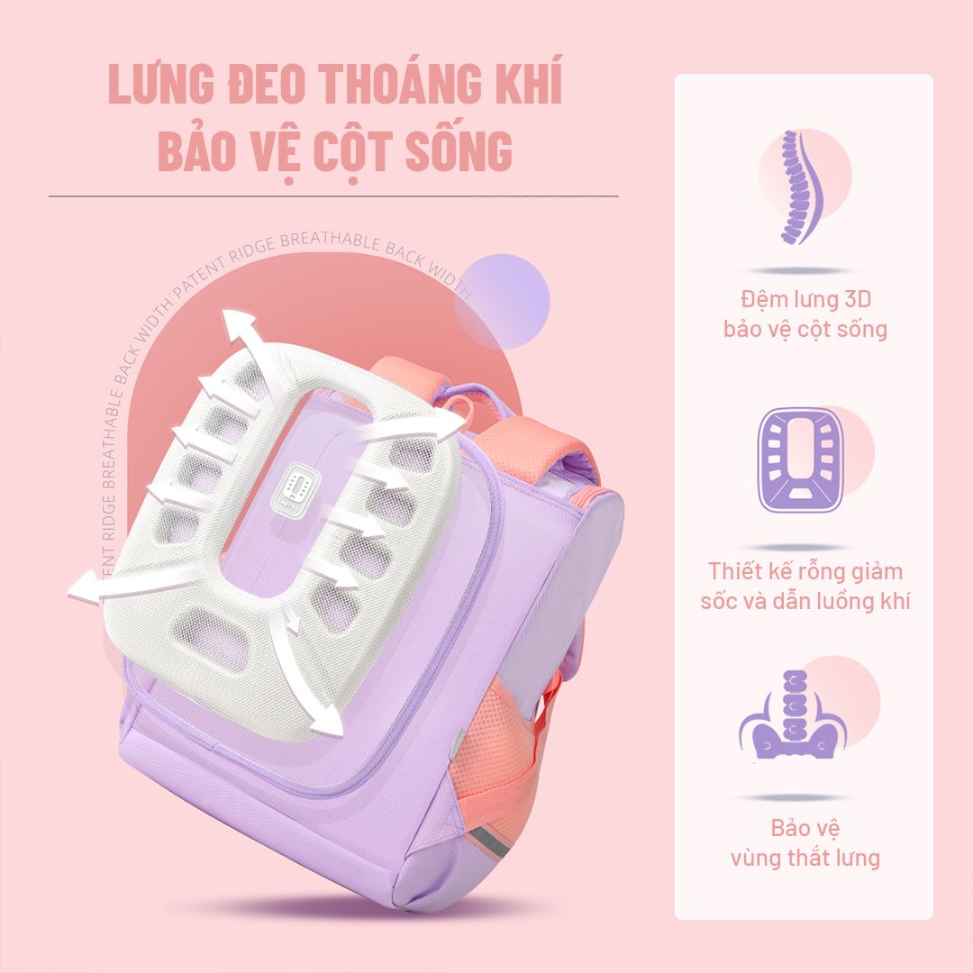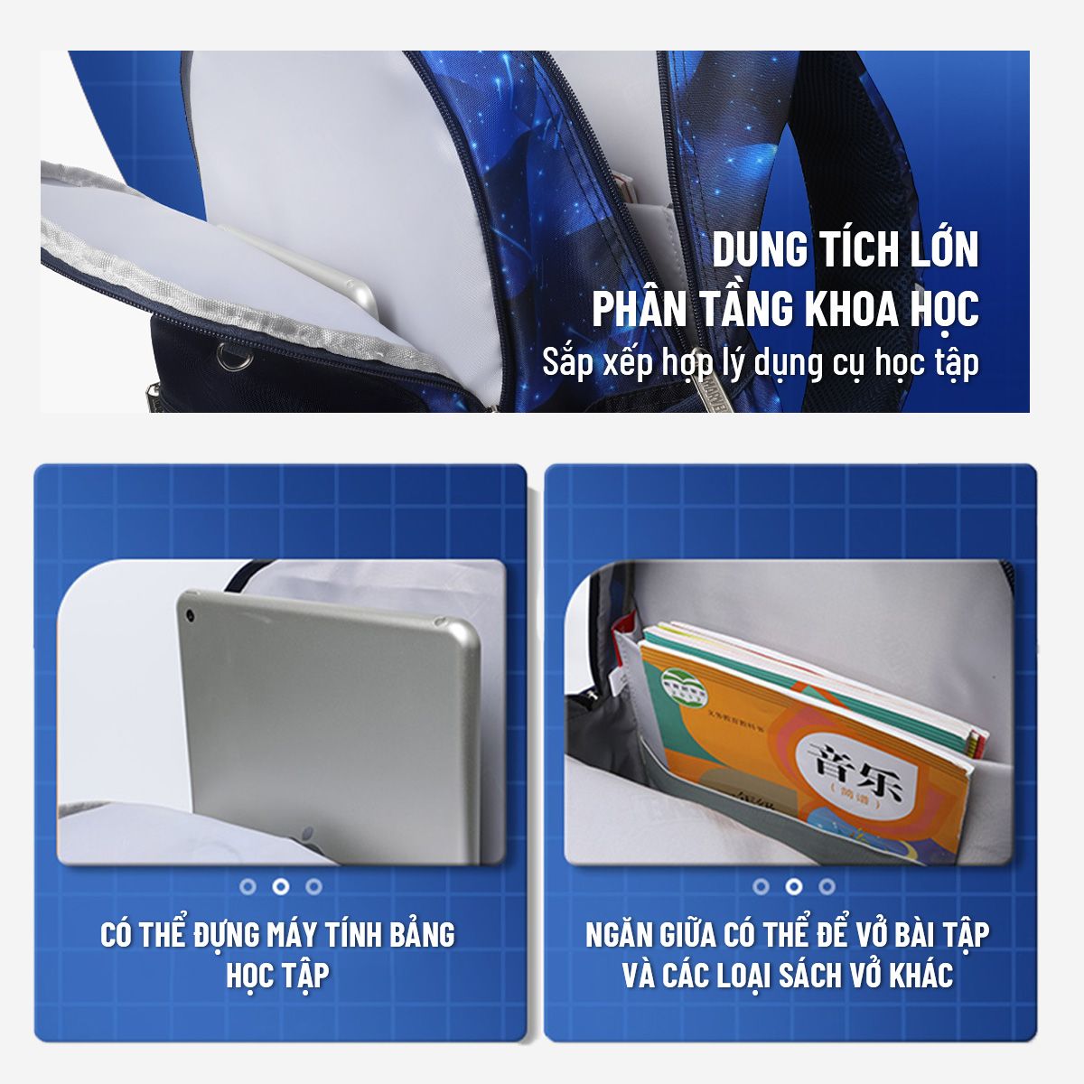 Kích thước & dung tích: Nhỏ gọn nhưng dung tích lớn (từ 26×16×38 cm đến 31×17×42 cm), ngăn chính rộng rãi đựng sách vở, bút; ngăn phụ và ngăn trước có khoá kéo hoặc Velcro đựng thẻ học sinh, tập vở; ngăn bên hông tiện lợi đựng bình nước, ô dù.