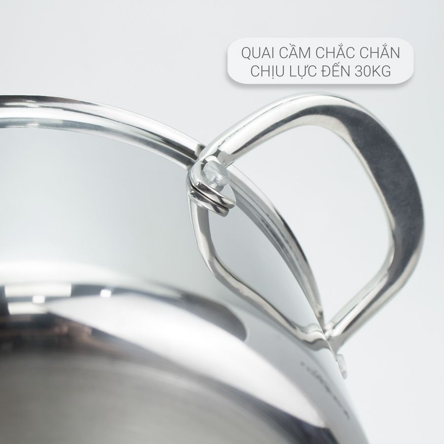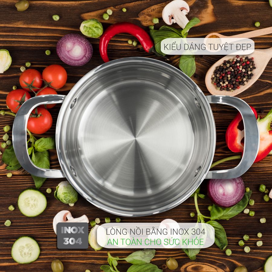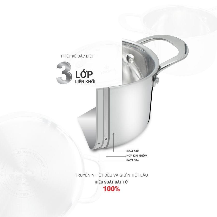 Cấu tạo 3 lớp liền khối: Lớp trong cùng inox 304, lớp giữa là nhôm nguyên chất và lớp ngoài cùng là inox 430.